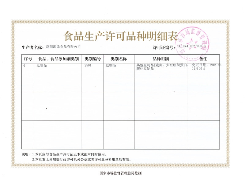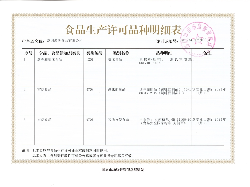 源氏食品生產(chǎn)許可證及細(xì)節(jié)列表 發(fā)布時間:2021-03-02作者:來源:洛陽源氏食品有限公司點擊:5969 上一篇:營業(yè)執(zhí)照 下一篇:老式大辣片出廠檢驗 分享到:0 用手機(jī)看 拍下二維碼,信息隨身看 試試用微信掃一掃,在你手機(jī)上繼續(xù)觀看此頁面。